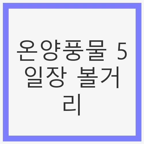 온양풍물 5일장은 충남 아산시의 온양온천역 인근에서 열리는 전통적인 장터입니다. 매달 정해진 날짜에 열리는 이 시장은 다양한 상품과 먹거리로 가득 차 있어 방문객들에게 즐거운 경험을 선사합니다. 시장은 대규모로 운영되며, 각종 농수산물, 공예품, 그리고 먹거리가 다양하게 진열되어 있어 그 자체로 하나의 문화 체험장이라고 할 수 있습니다.