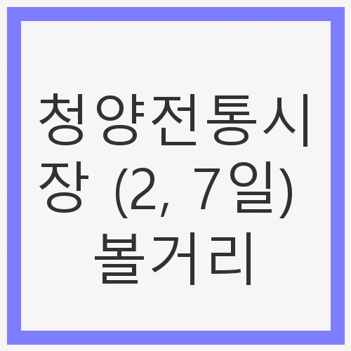 2일과 7일에 열리는 청양전통시장의 오일장은 이곳의 핵심 매력 중 하나입니다. 매번 수많은 상인들이 즐거운 분위기 속에서 판매를 하고, 방문객들은 이 시장의 다채로운 상품들을 즐길 수 있는 기회를 가집니다. 장터에는 신선한 수산물, 농산물, 그리고 지역 특산품들이 가득합니다.