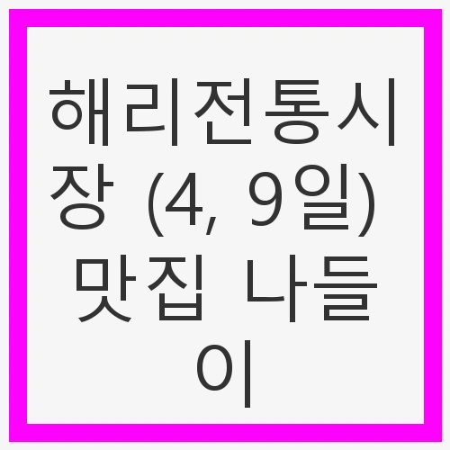 따뜻한 봄날, 기분 좋은 나들이를 계획하신다면 해리전통시장이 제격입니다. 매달 4일과 9일에 열리는 이 전통시장은 다양한 먹거리를 제공하며, 지역 주민들의 사랑을 받고 있습니다. 오늘은 해리전통시장에서의 맛집 나들이를 소개해 드리겠습니다. 시장의 매력과 함께 즐길 수 있는 음식들을 찬찬히 살펴볼까요?