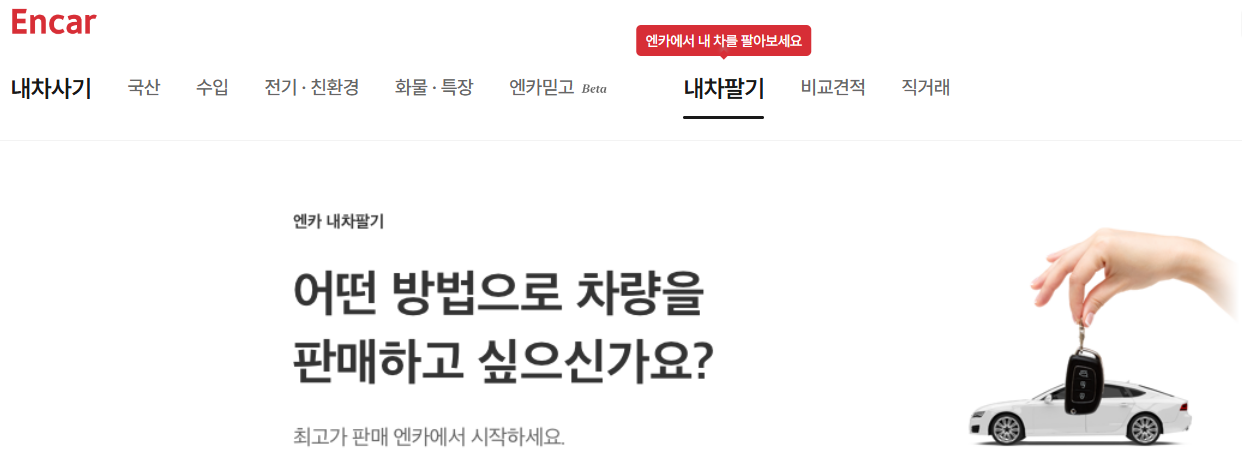 https://www.encar.com에 접속한 후, 상단 메뉴에서 **‘내차팔기’**를 클릭합니다.